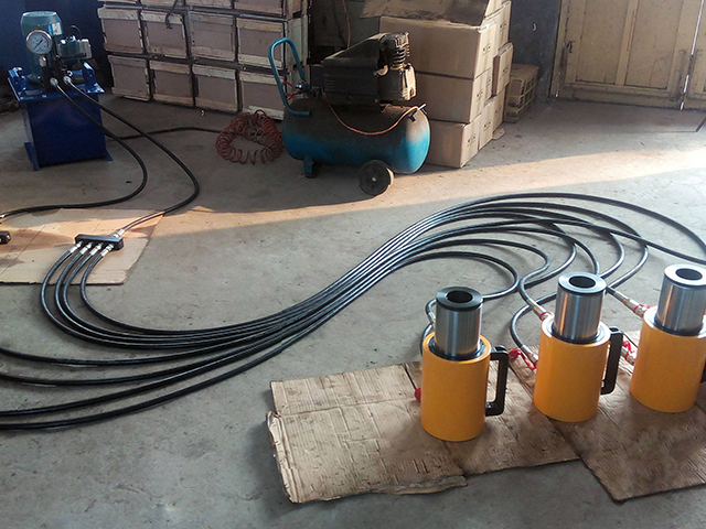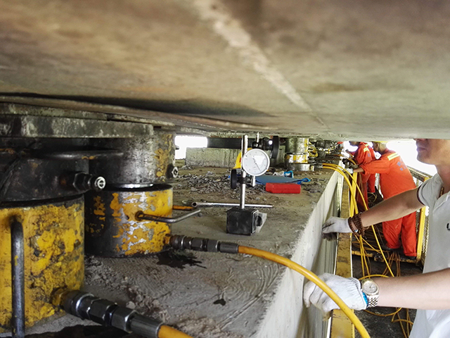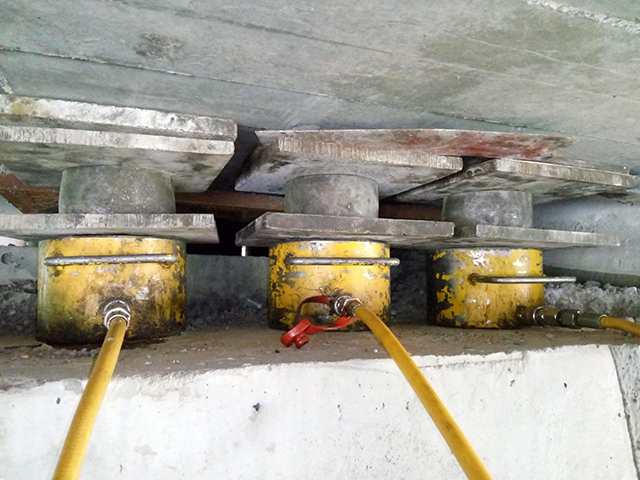 橋梁頂升即是在原橋臺附近開挖基坑澆筑臨時砼作為頂升支架的基礎(chǔ),頂升支架采用無縫鋼管,無縫鋼管加工高度根據(jù)現(xiàn)場情況實測高度進(jìn)行加工,保證同軸無縫鋼管上部放置工字梁面處于同一高度,鋼管上放置頂升用千斤頂,千斤頂上放置工字梁作為分配梁與梁底之間用組合鋼楔緊密接觸。并在橋臺或墩柱外側(cè)安裝防位移裝置(高度根據(jù)現(xiàn)場實際情況而定)。頂?shù)轿缓舐淞簤|好臨時支撐柱。在原橋臺、墩上進(jìn)行支座墊石放樣,鑿除埋設(shè)支座墊石基槽并打磨平整,調(diào)制環(huán)氧砂漿安放支座墊石,對支座墊石進(jìn)行焊接,然后安放橡膠支座并找平、落梁。