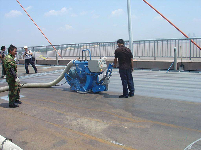 橋梁混凝土鋪裝層處理采用拋丸工藝,即利用拋丸機,拋除混凝土表面的浮漿。使用拋丸處理的表面粗糙均勻;不會破壞原混凝土結(jié)構(gòu)和平整度,并且可以完全去除浮漿和起砂,100%“創(chuàng)面”、露骨;但同時不會造成骨料的松動和微裂紋,為增強混凝土與瀝青面層提供更好的粘結(jié)。