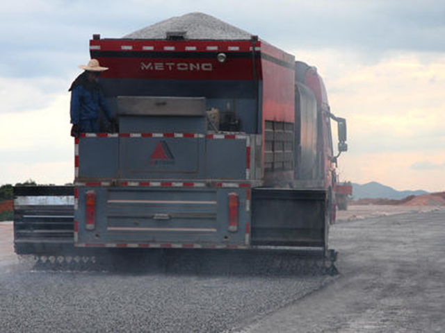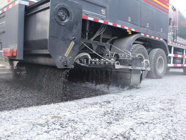 同步碎石封層用于下封層,施工后可有效防水,保護(hù)路基防止凍融破壞;次年攤鋪時(shí)上下層接合更好;可適當(dāng)開放交通允許車輛碾壓,保證路基安全過冬。